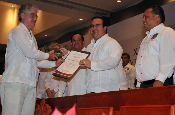 El Gobernador reconoció entonces a los ejidatarios de San Pedro Buena Vista, del municipio de Acajete, quienes en este galardón ven reflejado su esfuerzo y además felicitó al director del Instituto de Ecología (Inecol), Martín Ramón Aluja Schuneman Hofer, quien recibió el Premio Nacional de Ciencias y Artes 2013, en el campo de Tecnología, Innovación y Diseño, por sus contribuciones científicas y tecnológicas al manejo de plagas agrícolas.