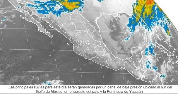 Nublado con tendencia a disminuir los mismo en el transcurso del día con bajo potencial de lluvias. Nieblas y lloviznas aisladas en zonas serranas nocturnas a matutinas. Viento variable, fijándose al este y sureste de 20 a 30 km/h. Ambiente frío a fresco con heladas al amanecer en las partes altas de zonas montañosas. Gradual recuperación de la temperatura diurna. T.máx/T.mín (ºC): Orizaba 16/07, Tierra Blanca 23/15, Cosamaloapan 21/15, Alvarado 20/14, Ángel R. Cabada 19/14, Catemaco 18/13 y San Juan Evangelista 22/16.