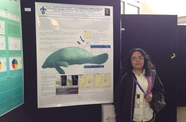 Morales García, quien viajó acompañada de su tutora de tesis y docente de la misma Facultad, Ibiza Martínez Serrano, expuso que en la década de los noventa se consideró extinta la especie de manatí en el sur de Veracruz, específicamente en el río Coatzacoalcos, debido a la contaminación del mismo, el tráfico de buques y la pérdida de su hábitat.