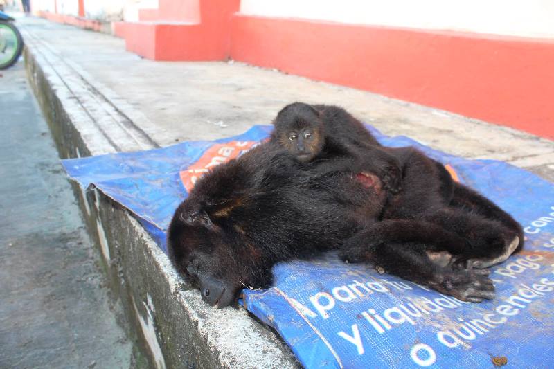 Una familia encontró en la carretera en ampliación (Villahermosa-Escárcega) una mona adulta atropellada con una cría la cual todavía estaba viva. El bebé se encontraba en un estado físico de gravedad con costillas y otros huesos fracturados. Ambas murieron.
