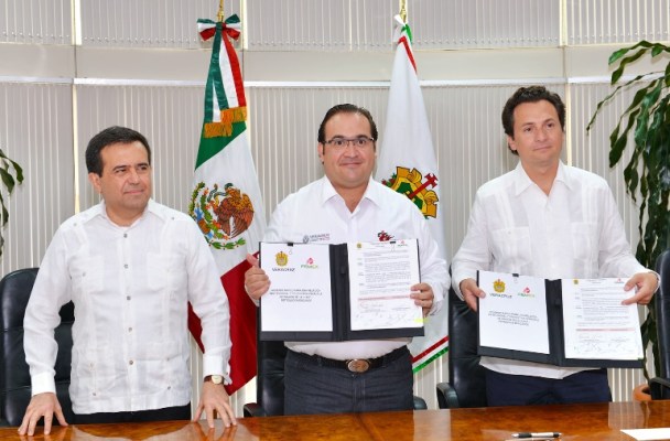 Este jueves, el mandatario estatal, el director general de Petróleos Mexicanos, Emilio Lozoya Austin, el secretario de Economía, Idelfonso Guajardo Villareal, y el director de Nacional Financiera (Nafin), Jacques Rogozinski Schtulman, signaron el Acuerdo Marco para una Relación Institucional y Productiva entre el Estado de Veracruz y Petróleos Mexicanos.