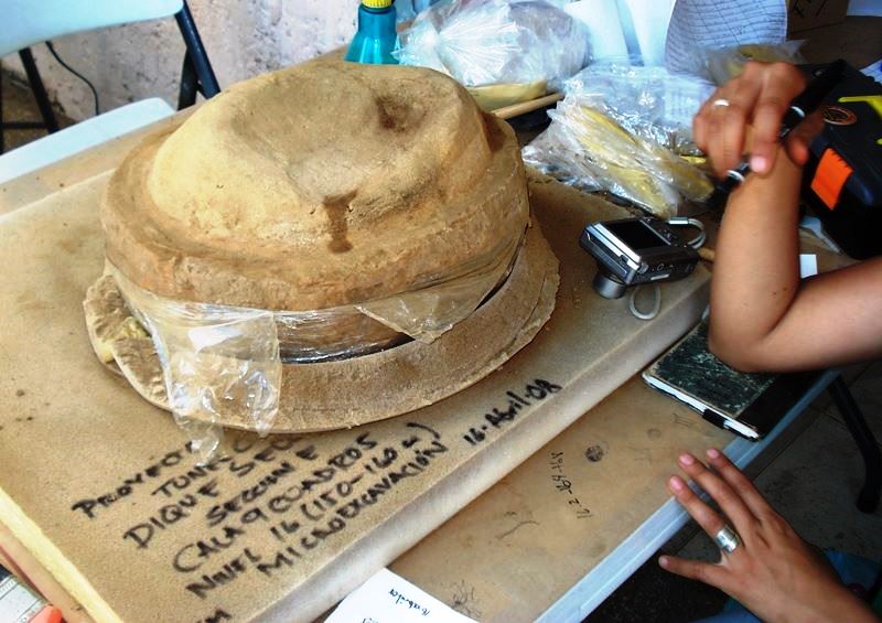 Con el paso del tiempo la madera desapareció, pero la impronta formada por el chapopote que se usó para impermeabilizarlo aún se conservaba.