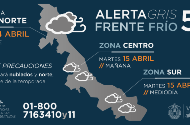 Detrás del frente 50, la potente masa de aire frío que lo origina se prevé ocasione un evento de norte de 70 a 80 kilómetros por hora, con rachas de 110 a 130 km/h en la costa y menores en las regiones de montaña de Huayacocotla, Misantla y Xalapa (60-80 km/h), además de un descenso notable de la temperatura y oleaje de cuatro a seis metros, por lo que la dependencia mantiene la Alerta Gris preventiva, sugiriéndose se tomen las medidas pertinentes.