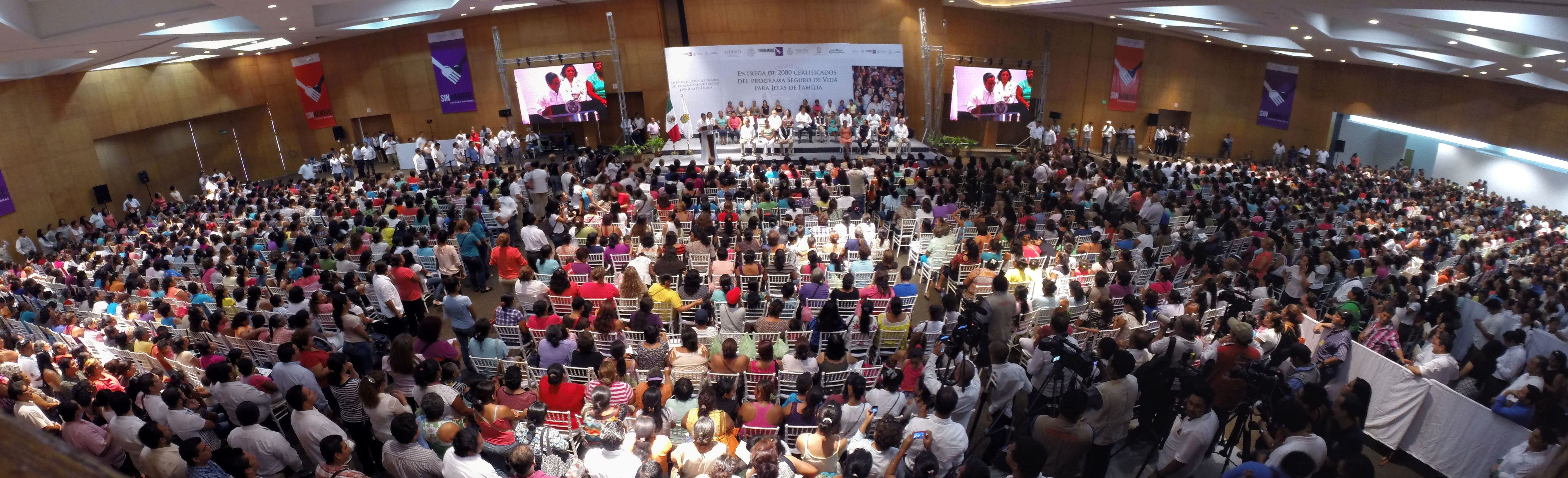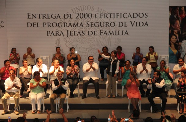 Durante este evento, la titular de Sedesol, Rosario Robles Berlanga, y el gobernador Javier Duarte de Ochoa entregaron sus pólizas de Seguro de Vida para Jefas de Familia a María Victoria Saldiel Aguilar, Sara Fernández Sastré, Rubicelia Casanova Antonio, Raquel Rasgado Sánchez y Andrea Vidal Hernández.