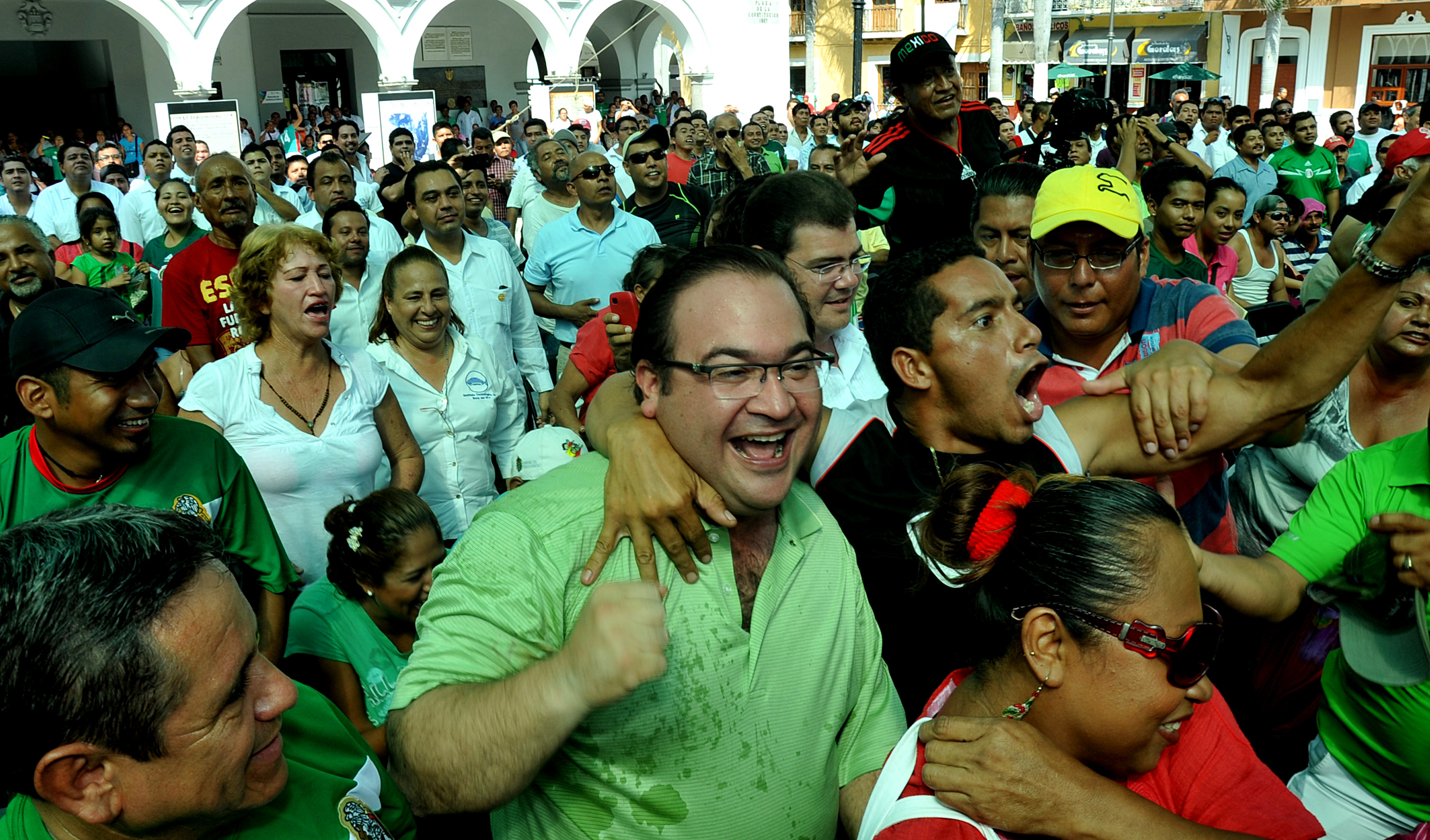 Veracruz. En medio de un ambiente de fiesta por el triunfo de la Selección Mexicana ante Croacia, el gobernador Javier Duarte de Ochoa celebró los goles de México junto a los veracruzanos que se dieron cita en el Zócalo porteño para disfrutar del partido, donde el mandatario reconoció el trabajo del futbolista veracruzano Miguel Layún durante el partido.