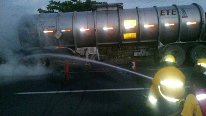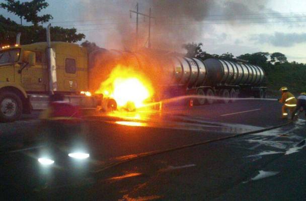 Afortunadamente se pudo controlar el incendio iniciado en las llantas, antes que ocurriera una desgracia por lo flamable y peligroso del producto combustóleo que transportaba la unidad de doble remolque.