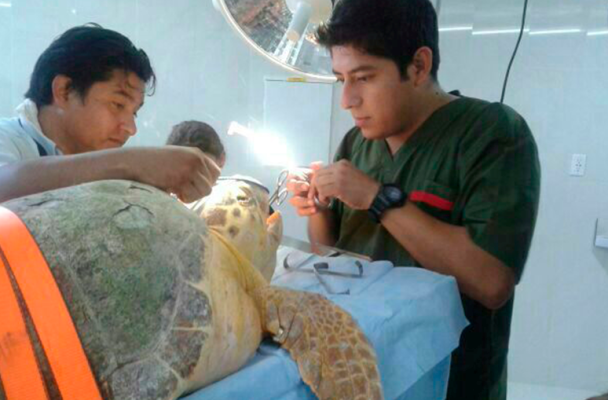 Salvan de morir a tortuga caguama; en cirugía le quitan anzuelo de pesca