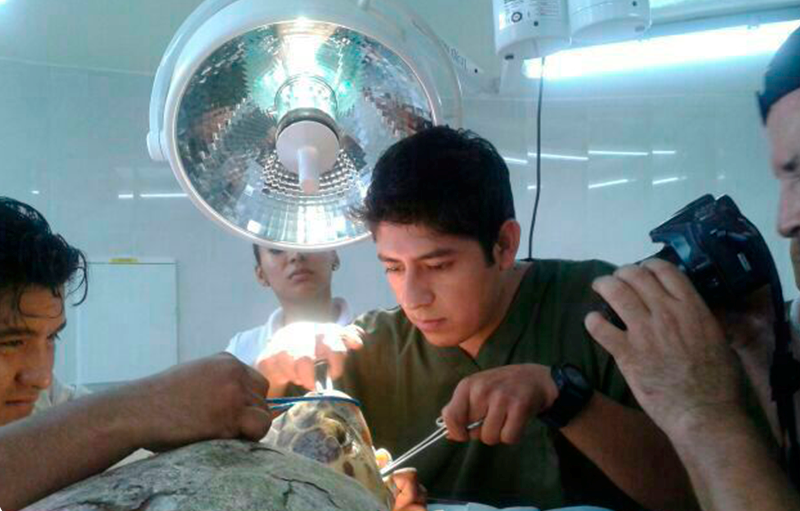 Cirujanos zootecnistas del Acuario de Veracruz salvaron de morir a una tortuga de la variedad caguama que mordió un anzuelo por la pesca inmoderada en acuíferos de las Barrancas, zona centro del estado