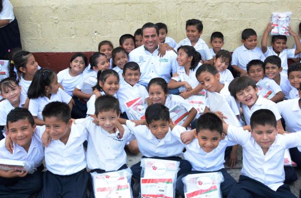 Entrega 350 paquetes de útiles escolares a niños de la escuela Miguel Hidalgo y Costilla.