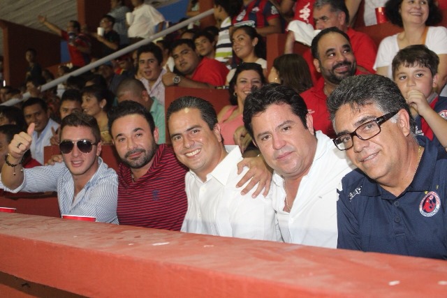 Coatzacoalcos.- El alcalde de Coatzacoalcos, Joaquín Caballero Rosiñol; la presidenta del DIF municipal, Cristina Cházaro de Caballero; el presidente del Club Delfines de Coatzacoalcos, Roberto Chagra Nacif; y el presidente de los Tiburones Rojos, Fidel Kuri Jr. presenciaron el encuentro amistoso entre Delfines Atlético Coatzacoalcos y Tiburones Rojos de Veracruz.