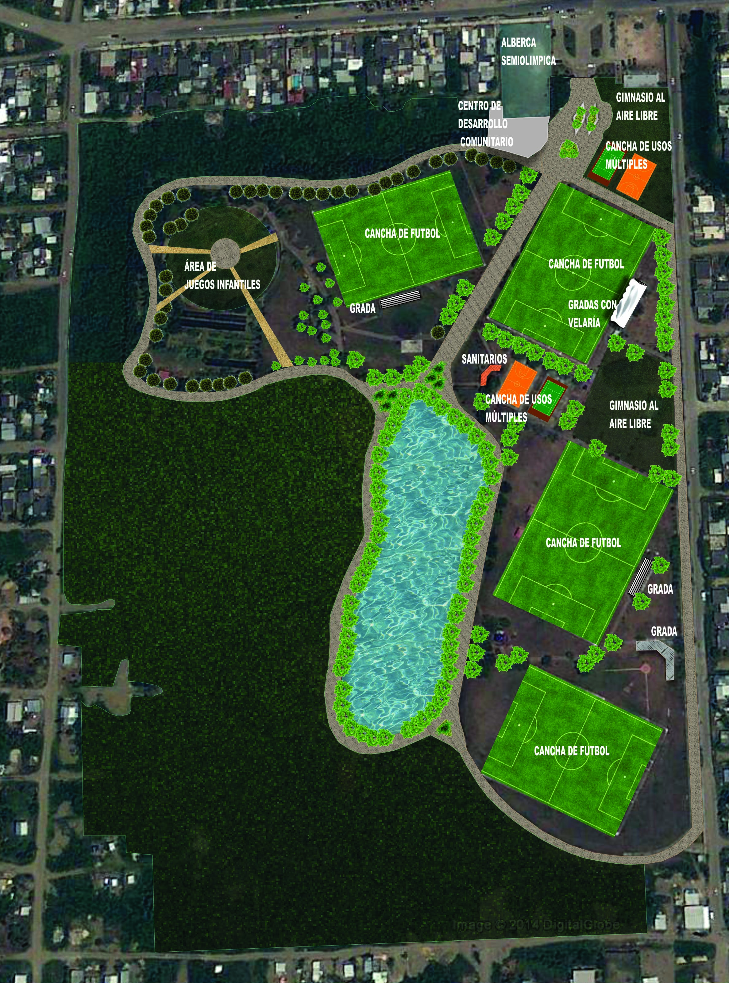 La obra incluye rehabilitación de canchas de usos múltiples y de futbol; rehabilitación de baños; alumbrado en cancha, en áreas comunes y andadores; gimnasio al aire libre, juegos infantiles, mobiliario urbano y barda.