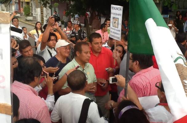 El presidente de Coatzacoalcos, Joaquín Caballero Rosiñol, salió del Ayuntamiento para dialogar con los manifestantes que le lanzaron fuertes gritos, consignas contra el Gobierno local y Estatal.