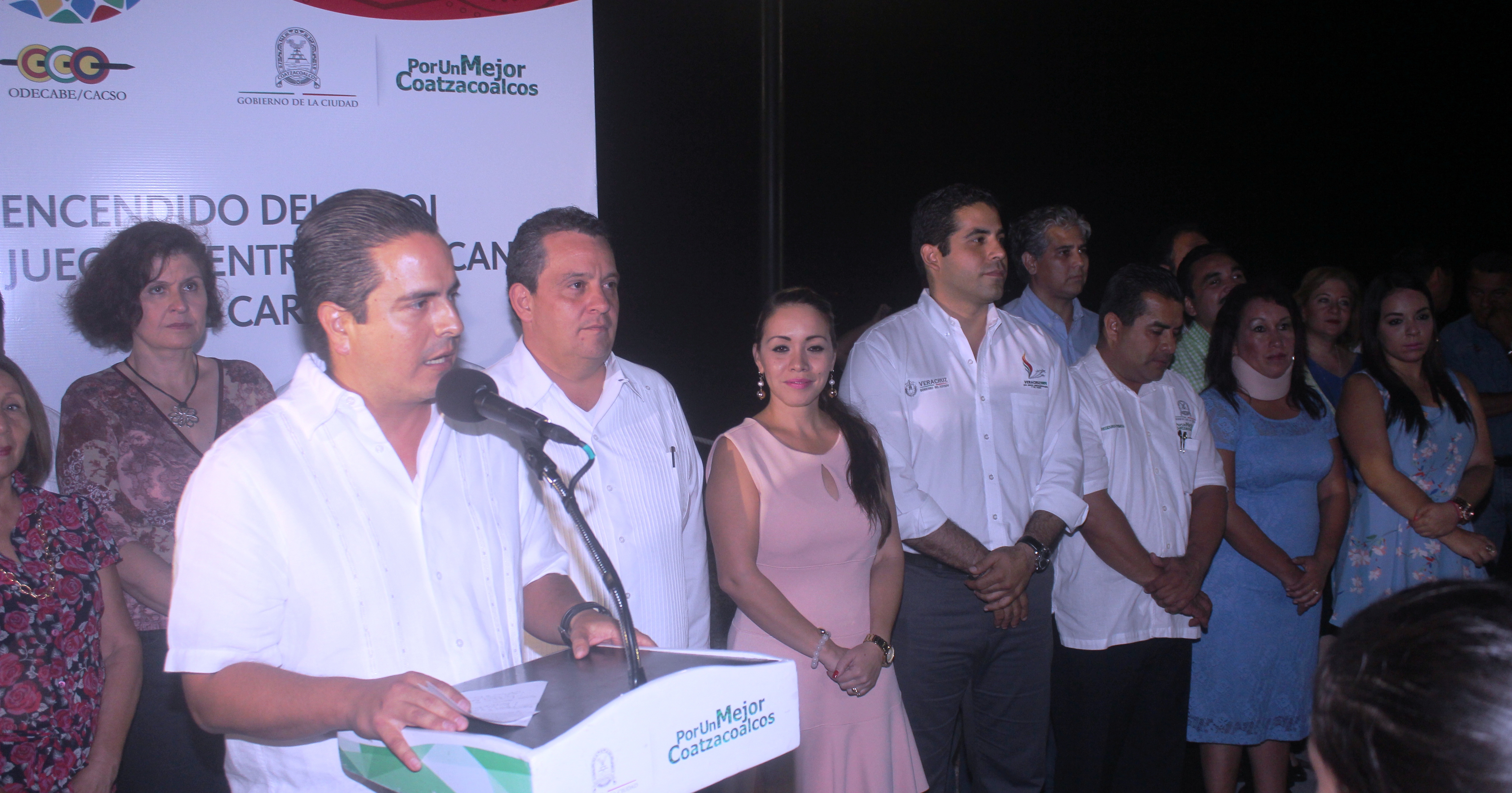 En la Plaza de los Centroamericanos, acompañado de la presidenta del DIF municipal, Cristina Cházaro de Caballero y del director general de los Juegos Centroamericanos, Carlos de Jesús Sosa Ahumada, el alcalde dijo que en Coatzacoalcos se entregará la primera medalla en el estado.