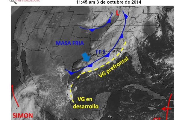 Este potencial será provocado por la llegada del Frente Frío número 5, que se aproxima al noroeste del Golfo de México y en las próximas 24 a 48 horas estará combinándose con una vaguada sobre el suroeste del mismo.