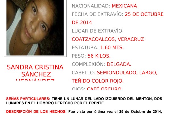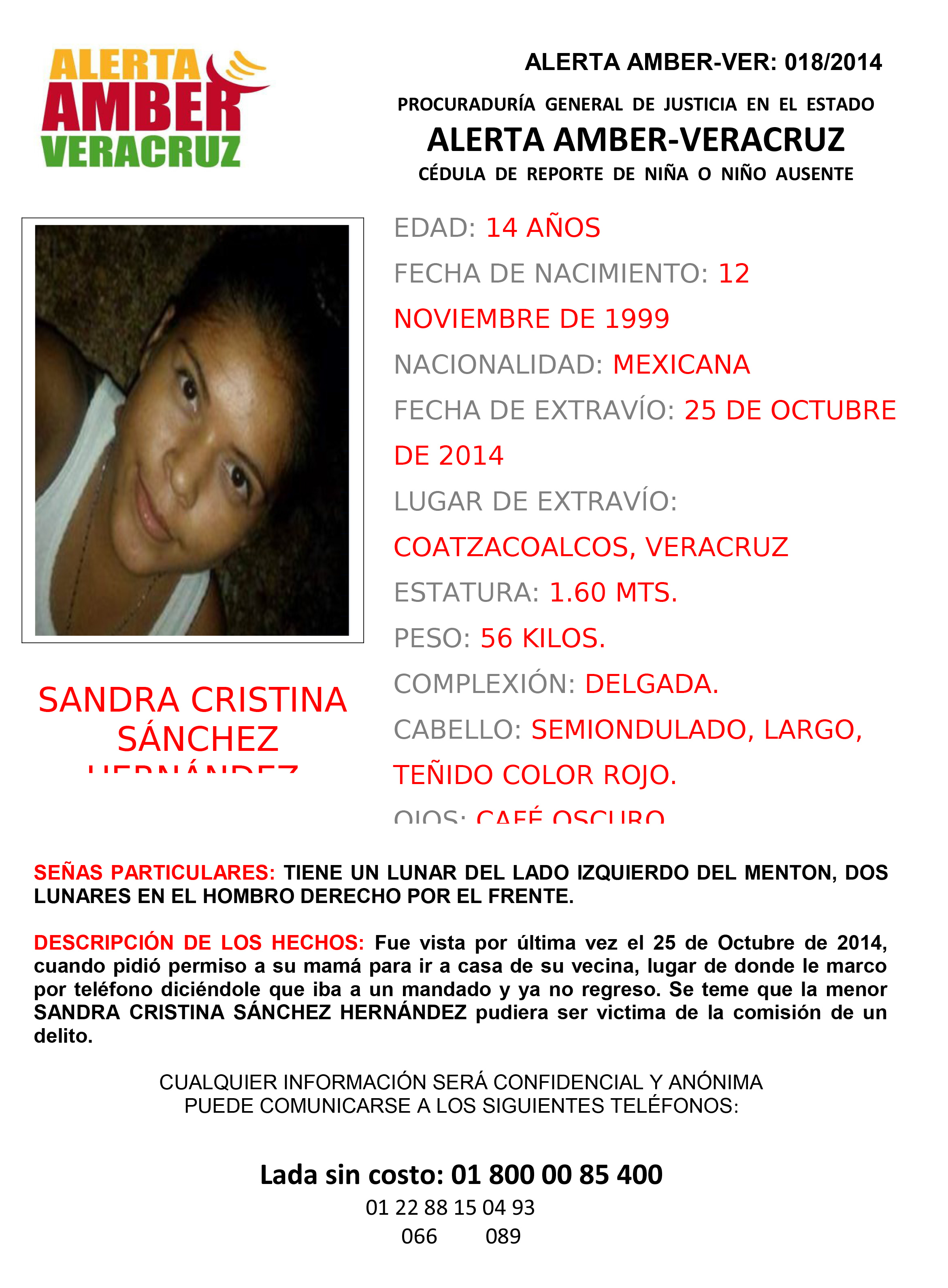 Xalapa.- Con motivo de la desaparición de la menor Sandra Cristina Sánchez Hernández, de quien se desconoce su paradero desde el pasado 25 de octubre del presente año, la Coordinación Veracruz activó la Alerta Amber 018/2014.