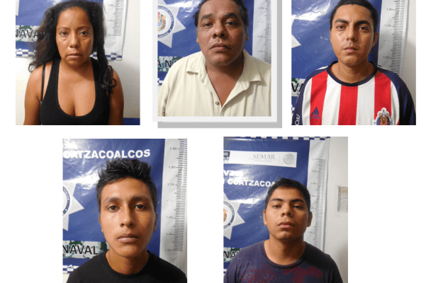 Producto del esquema de inteligencia policial desarrollado en el marco del operativo Blindaje Coatzacoalcos, efectivos de la Policía Estatal aprehendieron a José Alberto Díaz Sánchez, de 18 años; Cecilia Chandomi Cruz, de 38 años; José Manuel Rodríguez Carrera, de 21 años; Daniel Magaña Sánchez, de 45 años y Héctor David Díaz Sánchez, de 30 años, señalados por probables delitos contra la salud.