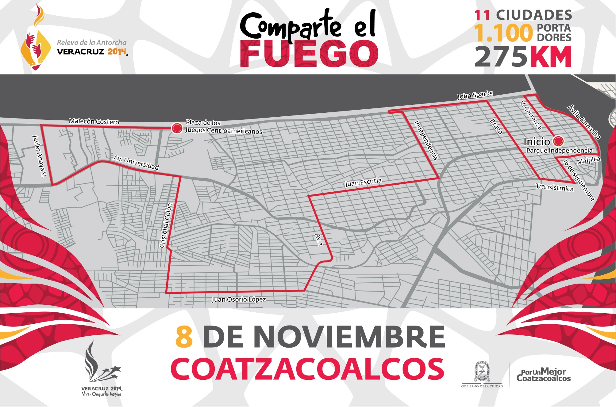 Coatzacoalcos.- El Gobierno Municipal presentó el recorrido de la antorcha de los Juegos Centroamericanos y del Caribe 2014, que llegará de Córdoba a Coatzacoalcos este sábado 8 y transitará por alrededor de cinco horas, 20 kilómetros de la ciudad, para partir a Tuxpan en un embarcación por el Golfo de México.
