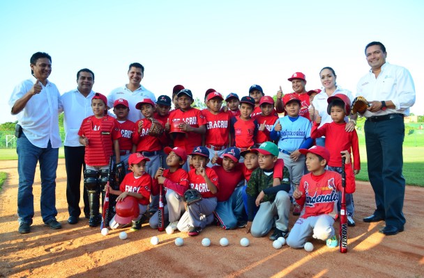 Los menores que entre 8 y 12 años de edad, recibieron su uniforme oficial: pantalón y camisa, así como 12 guantes, 4 bates, 24 pelotas y un juego de arreo que consta de una careta, una pechera y una rodillera para cátcher.