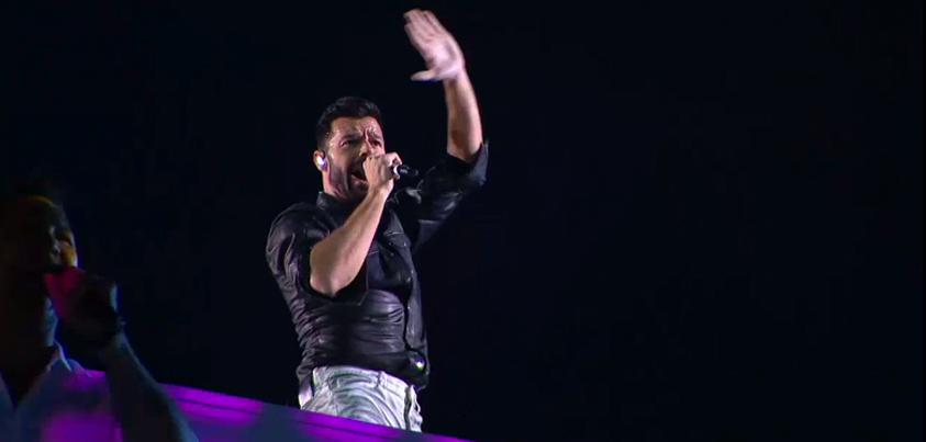 Por último, del juego de luces y pirotecnia, el cantante puertorriqueño Ricky Martin salió a escena alrededor de las 21:41 horas interpretando grandes éxitos como Livin’ la vida loca, Pégate y La copa de la vida.
