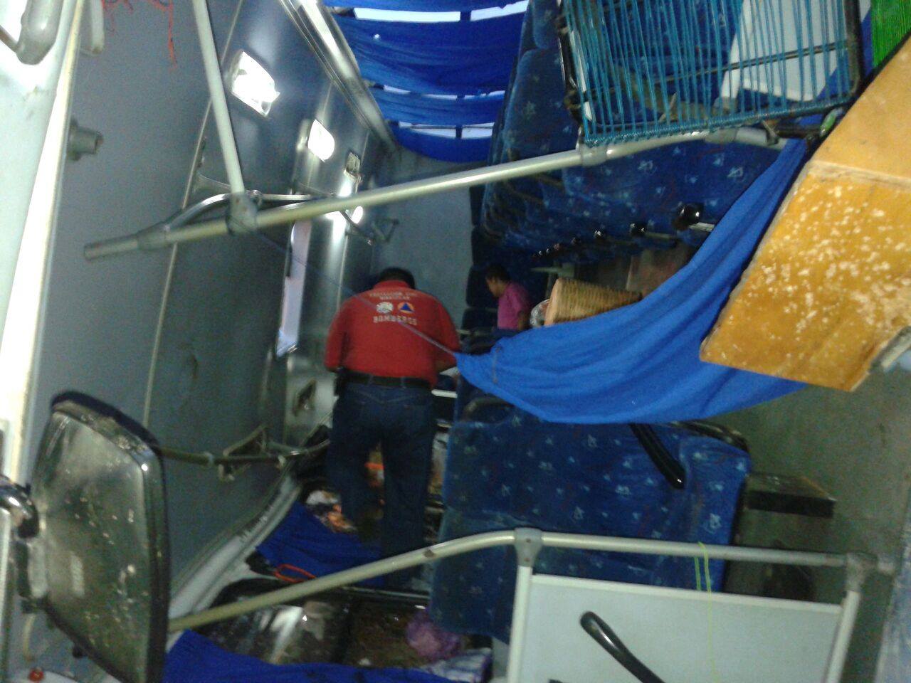Al lugar del accidente, se trasladaron personal abordo de las unidades PC-01 y BM-01, Protección Civil y Bomberos, los cuales los elementos encontraron el autobús de la línea Santa Clara volcado sobre su costado derecho.