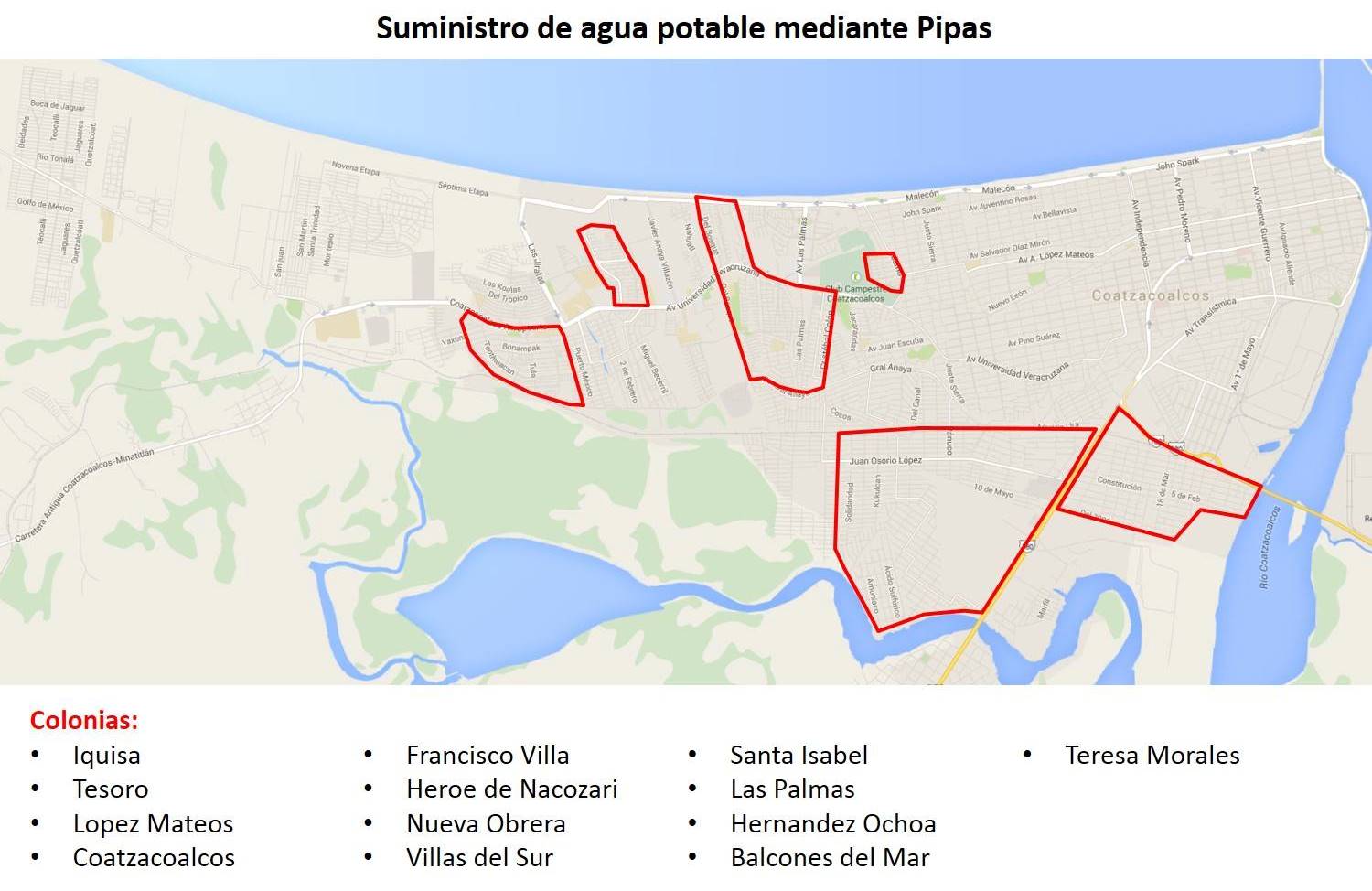 Las colonias que serán abastecidas con pipas este viernes, según el programa de tandeo, serán la Iquisa, Tesoro, López Mateos, Coatzacoalcos, Francisco Villa, Héroes de Nacozari, Nueva Obrera, Villas del Sur, Santa Isabel, Las Palmas, Hernández Ochoa, Balcones del Mar y la Teresa Morales.