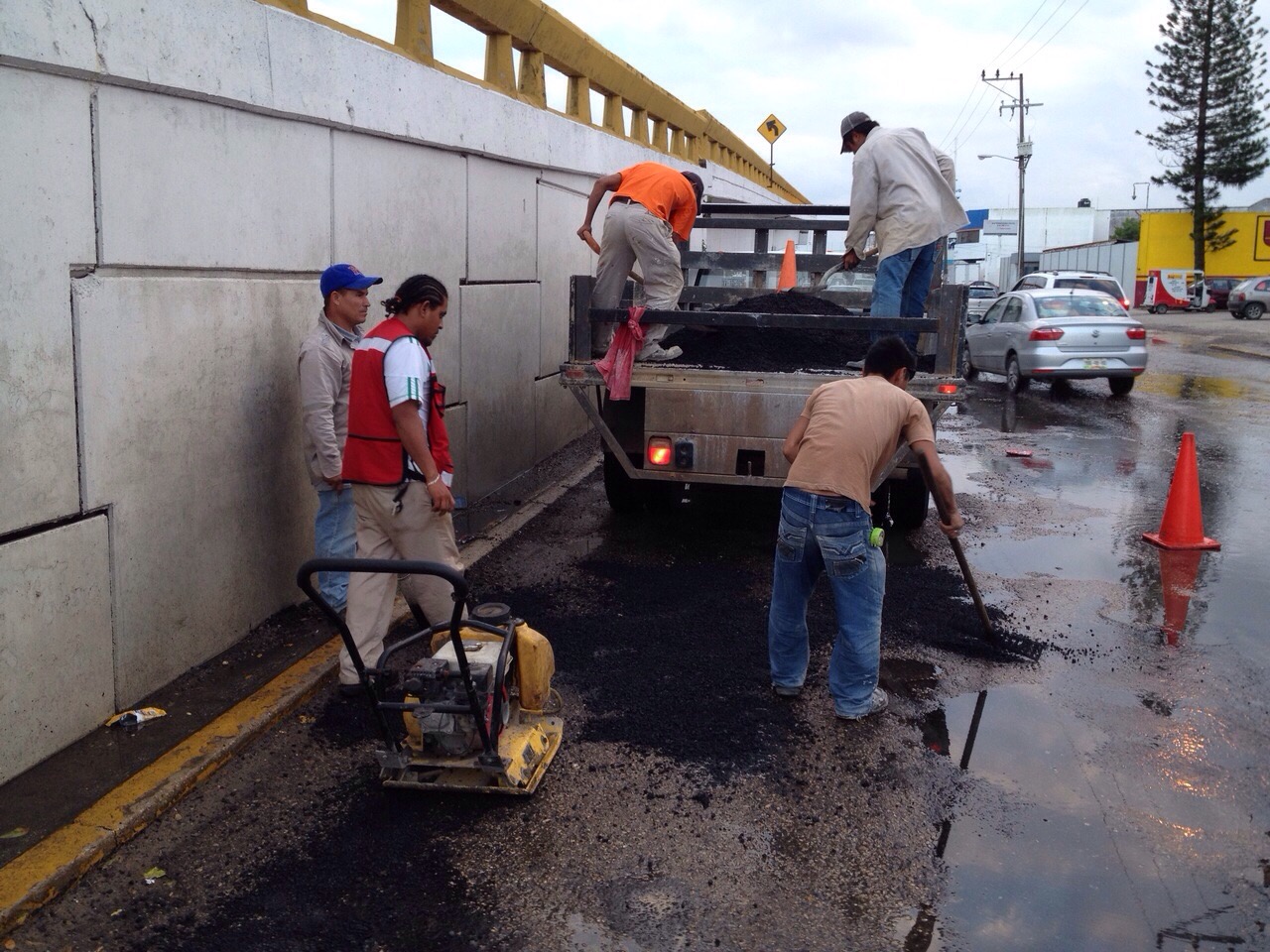 Tres cuadrillas cubren con mezcla asfáltica en frío, que puede aplicarse aún en piso húmedo, en avenida Universidad, Transístmica y carretera ancha.