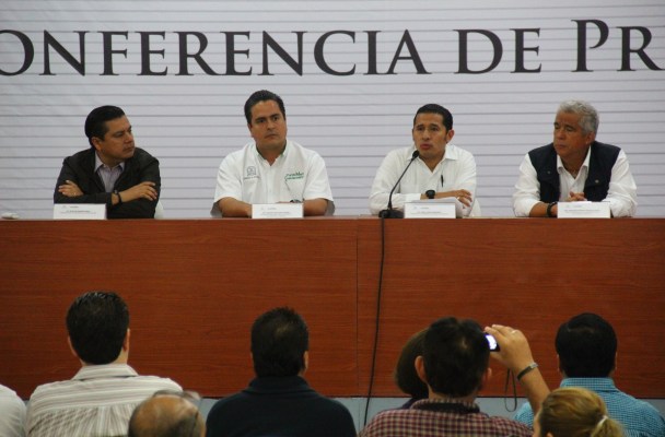 Autoridadesmunicipales y estatales en rueda de prensa para dar a conocer los acuerdos sostenidos con Tatahuicapan.