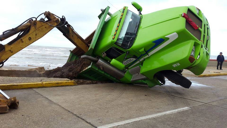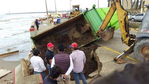 Debido al socavamiento que ha tenido el muro del malecón, tanto por el mal tiempo como porque constantemente le están sacando arena, la estructura se encontraba debilitada y no soportó el peso de la unidad cargada, misma que se subió a la banqueta y se llevó el muro, provocando que el volteo se hundiera.