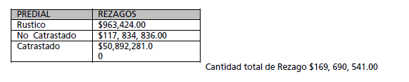 El rezago del Ayuntamiento por cobro del predial en modalidad Rústico es de 963 mil 424 pesos; en predios No Catastrados, es de 117 millones 834 mil 836 pesos y en predios Catastrados la cifra por cobrar es de 50 millones 892 mil 281 pesos.