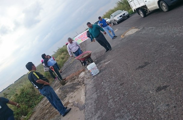 Maestros tapan baches de la carretera Coatza – Mina