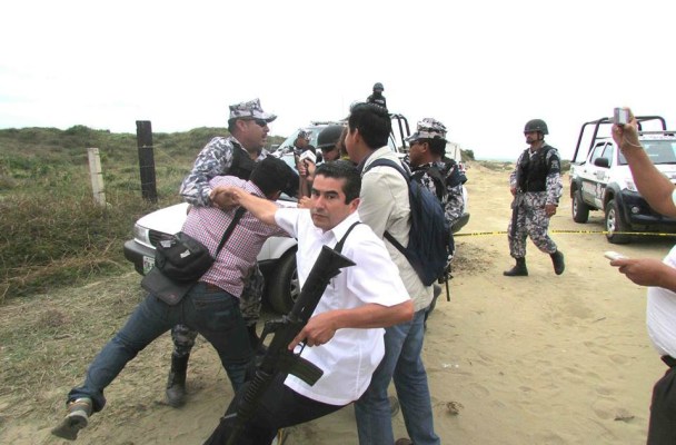 Judiciales agreden a la prensa local en su intento de ocultar la fosa clandestina de Coatzacoalcos.