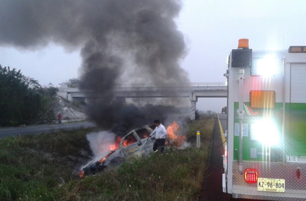 Elementos de las fuerzas de tarea acudieron al lugar del accidente para apagar las llamas del vehículo que quedo consumido por el fuego.