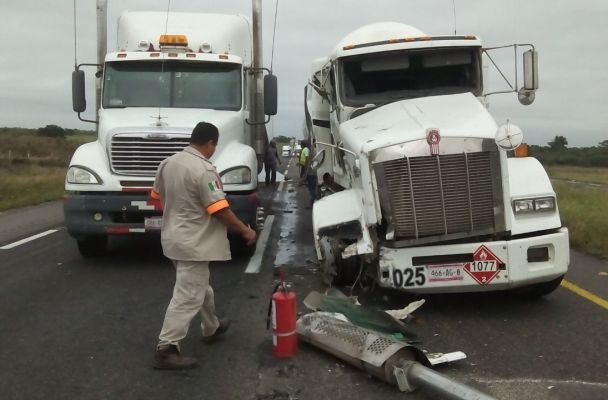 Dos trailers de carga con sustancias peligrosas chocaron en La Tinaja-Cosamaloapan.