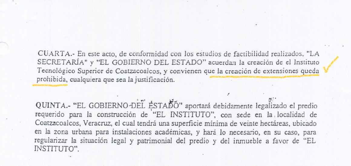 La cláusula cuarta del Convenio establece que el gobierno federal y estatal: «acuerdan la creación del Instituto Tecnológico Superior de Coatzacoalcos y conviene que la creación de extensiones queda PROHIBIDA, cualquiera que sea la justificación» .