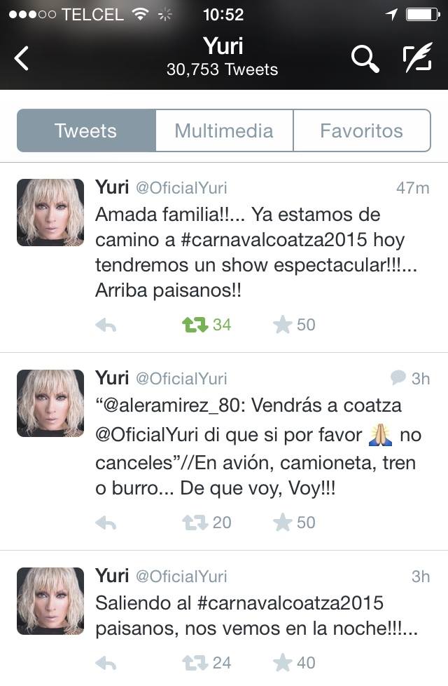 A pesar del fuerte norte, la cantante veracruzana Yuri afirma en twitter que viene a la ciudad para brindar «un show espectacular» en el Carnaval Coatza 2015