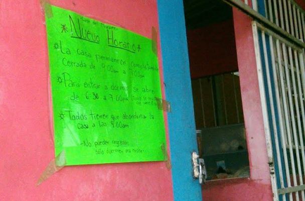 En un cartel pegado al interior del albergue se indica que “LA CASA PERMANECERÁ COMPLETAMENTE CERRADA de 09:00 a 07:00 PM” y “TODOS TIENEN QUE ABANDONAR LA CASA A LAS 09:00 AM”.