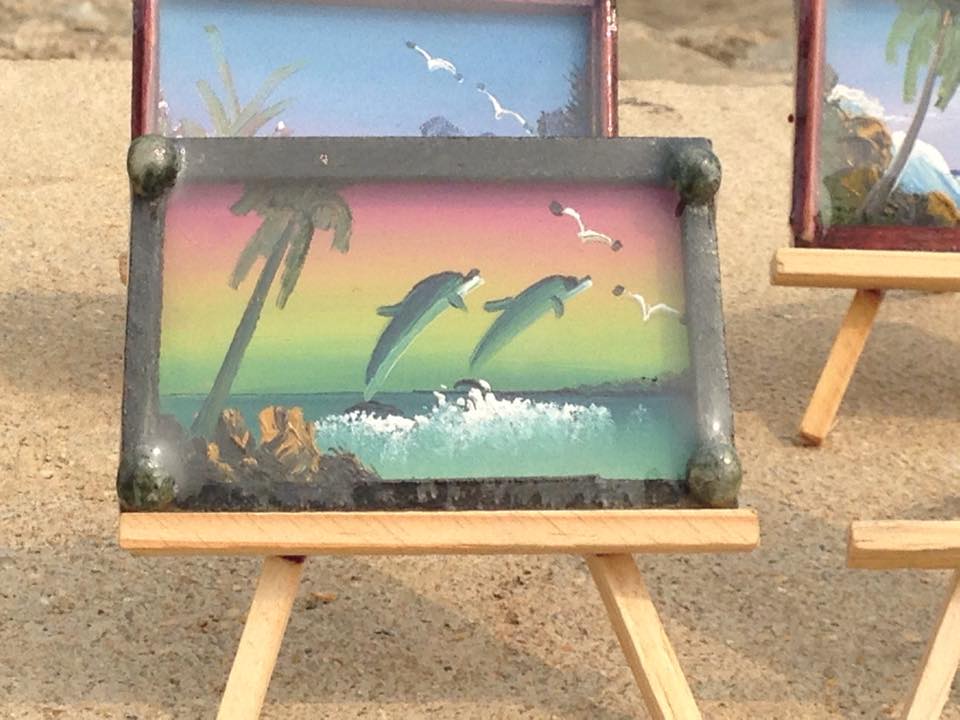 Son decenas de mini cuadros de paisajes, flores y animales, elaborados a través de las técnicas óleo y acuarela, que son exhibidos de manera improvisada en pequeños caballetes y cucharas de plástico.