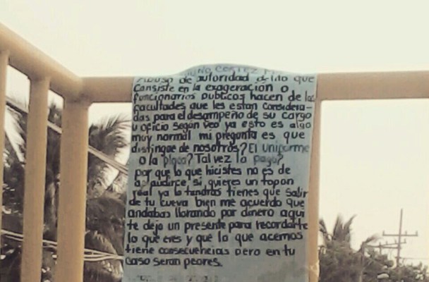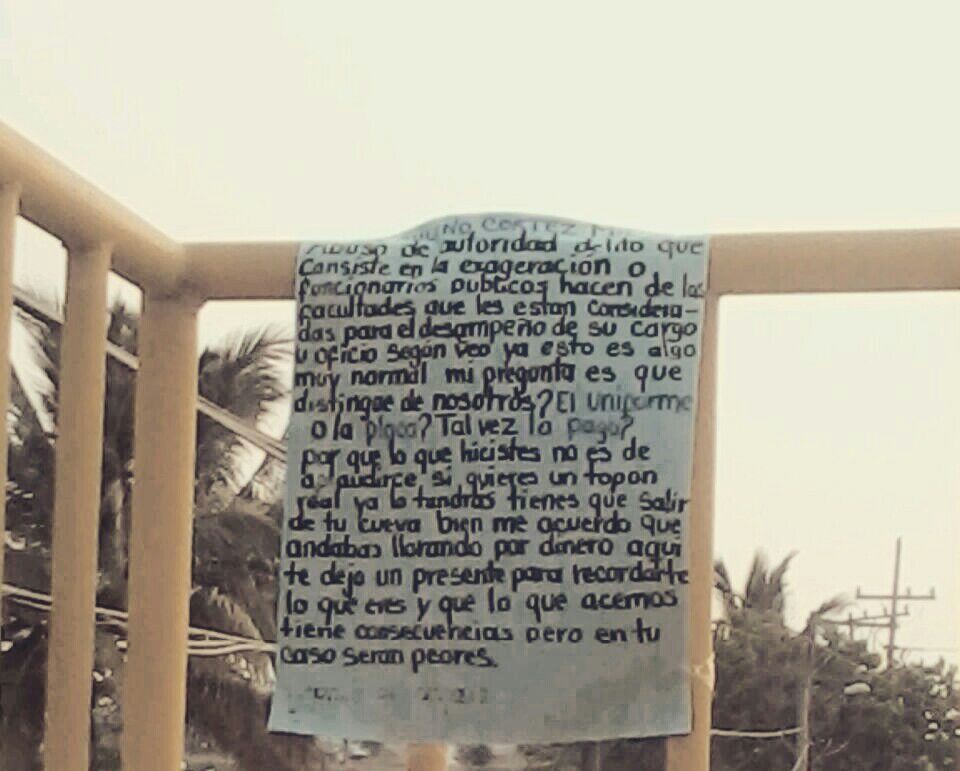 También apareció una más en Lerdo de Tejada. Ambas lanzaban consignas contra Paulino Cortés, comandante de la Secretaría de Seguridad Pública quien habría participado el pasado martes, en el abatimiento de cuatro delincuentes.