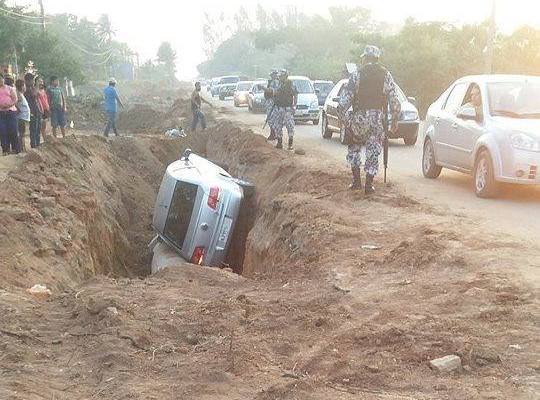Al esquivar el impacto se salió de la carretera por su lado izquierdo y fue a dar a una cuneta unos tres metros de profundidad donde se realizan trabajos del agua potable.