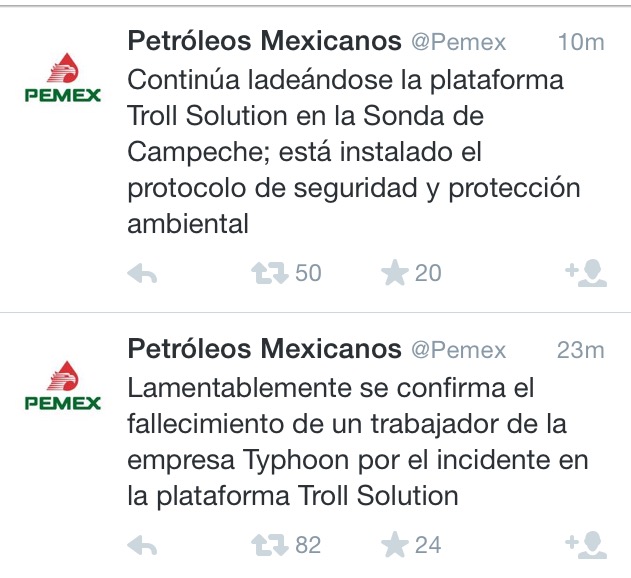 En un principio, Pemex había indicado a través de su cuenta de Twitter que el incidente dejó «un herido no grave», pero minutos después reportó la muerte de un trabajador de esa plataforma en la Sonda de Campeche.