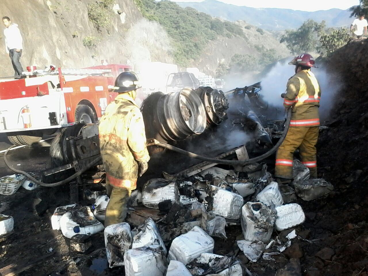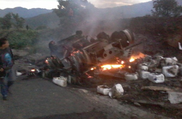 La unidad, que circulaba con la placas 981-EU4, transportaba galones de cloro; debido al impacto y al fuego, perecieron los cinco tripulantes: dos adultos (uno de ellos el chofer) y tres menores.
