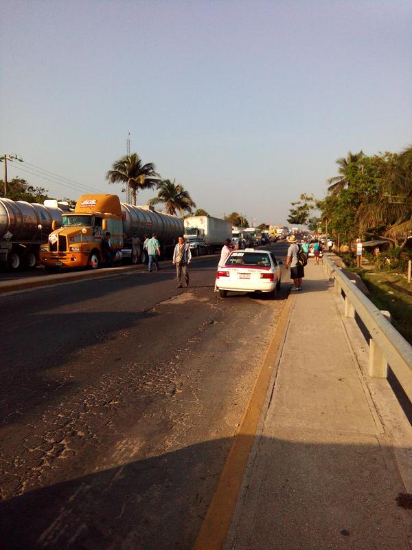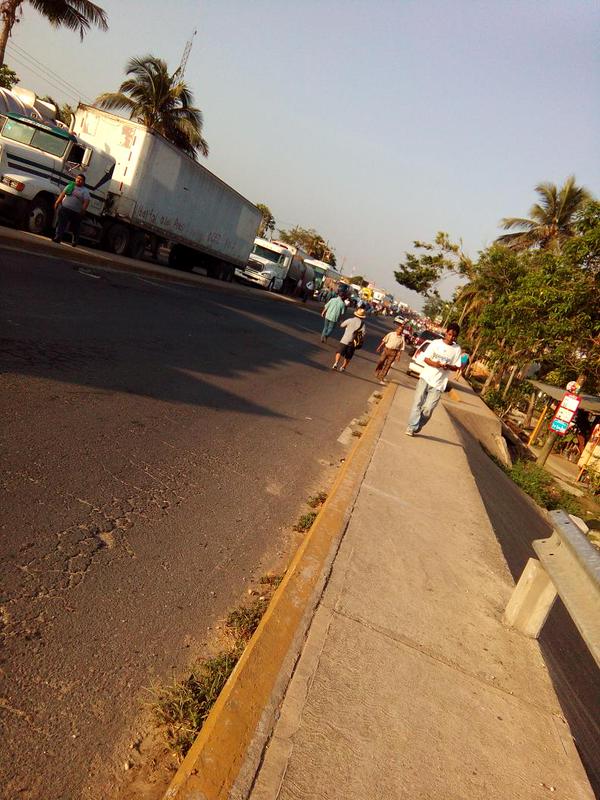 Largas filas de traileres varados en Las Matas. La gente que va hacia Cosoleacaque mejor se va caminando.