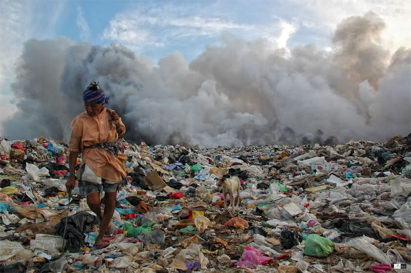 Entre un mar de basura con el fondo lleno de humo y acompañada de su fiel mascota esta pepenadora busca algo que le pueda servir. (Foto Alberto Ramos)