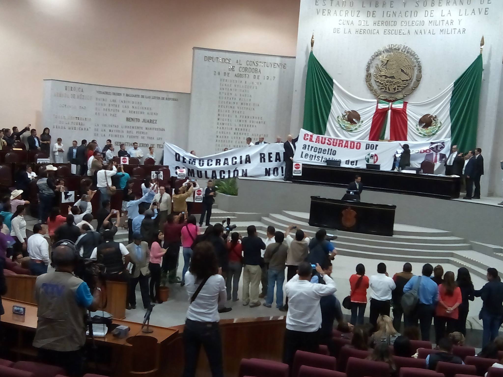 Xalapa, Ver.- Diputados de oposición intentaron reventar la sesión de este martes al tomar la Mesa Directiva en protesta porque la mayoría priista rechazó cada una de las propuestas de modificación a la reforma electoral enviada por el gobernador Javier Duarte de Ochoa.