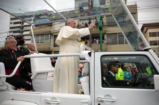 QUITO( Agencia Xinhua) El papa Francisco (c) saluda durante un recorrido por las calles de Quito, capital de Ecuador, el 5 de julio de 2015. El papa Francisco se encuentra en Ecuador para una visita pastoral de tres días, como parte de una gira latinoamericana que finalizará el 13 de julio y que incluye a Paraguay y Bolivia.