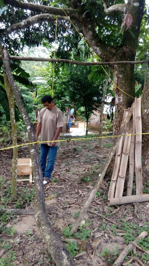 A unos diez metros de donde estaba el cuerpo de la mujer, se localizó el del varón, mismo que estaba colgado a una rama del árbol de mango, una silla de madera tirada donde se supone se subió para después dejarse caer.