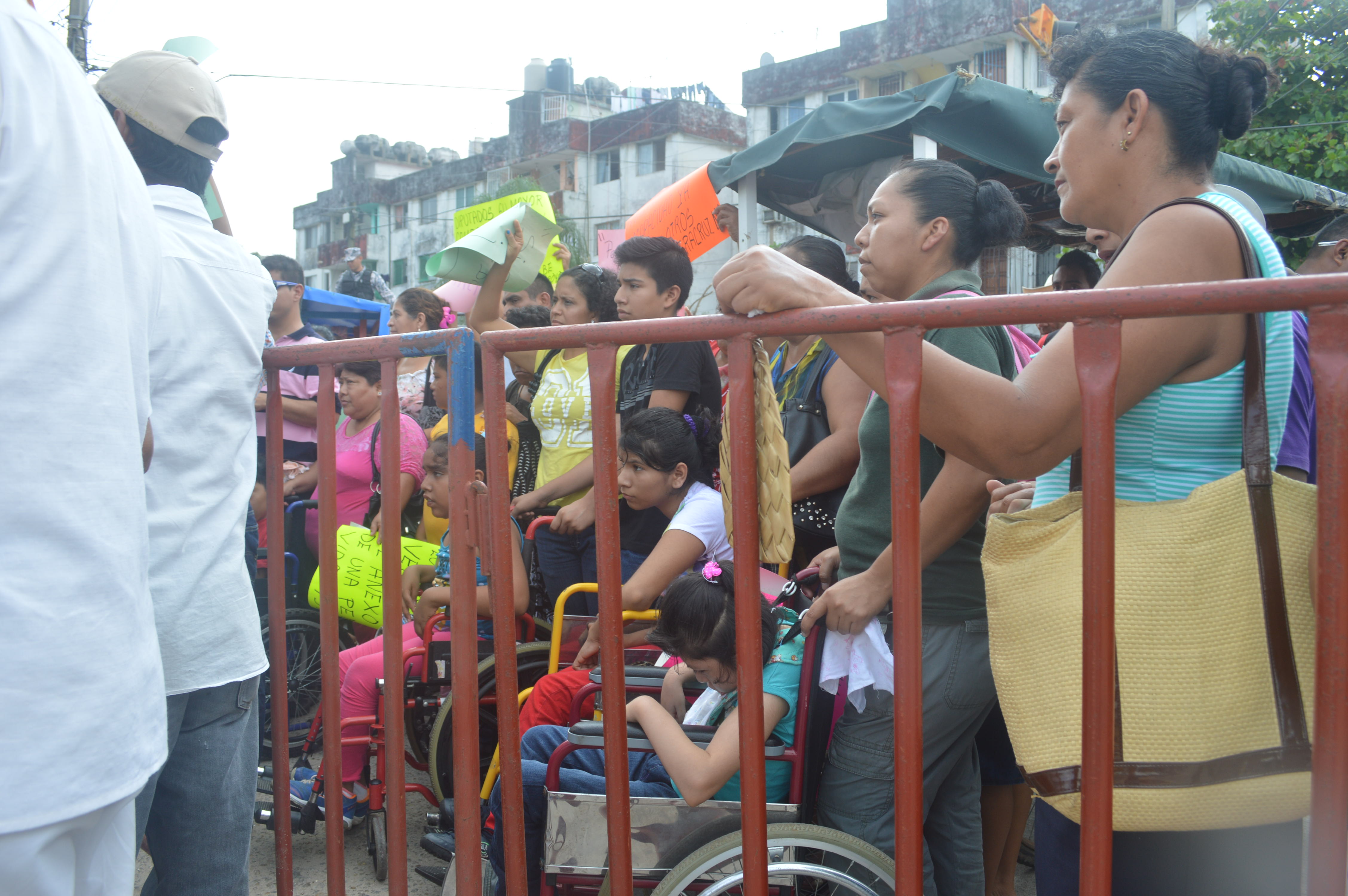 Minatitlán, Ver.- Familias con personas dicapacitadas de la zona sur de Veracruz se manifestaron esta mañana afuera de la sede provisional del Congreso del Estado en reclamo de la aprobación de una Ley de Pensión Universal a favor de personas que enfrentan alguna discapacidad severa, que les imposibilita valerse por sí mismo.