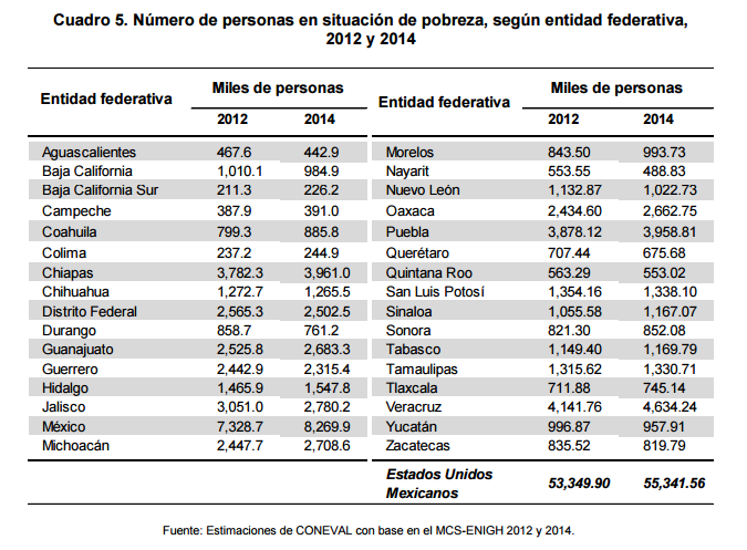 La población en pobreza aumentó de 53.3 a 55.3 millones de personas; la pobreza extrema se redujo de 11.5 a 11.4 millones de personas entre 2012 y 2014.