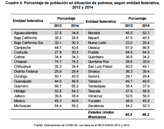 Entre 2012 y 2014 el porcentaje de población en pobreza subió de 45.5 a 46.2 por ciento. El porcentaje de pobreza extrema bajó de 9.8 a 9.5 por ciento.