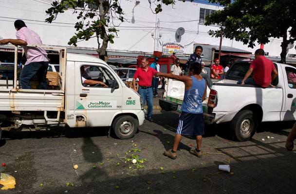 Coatzacoalcos, Ver.– A huevazos, tomatazos y cebollazos, los vendedores ambulantes que operan afuera del mercado Morelos repelieron este mediodía los intentos de desalojo por parte de las autoridades de la dirección municipal de comercio del Ayuntamiento.